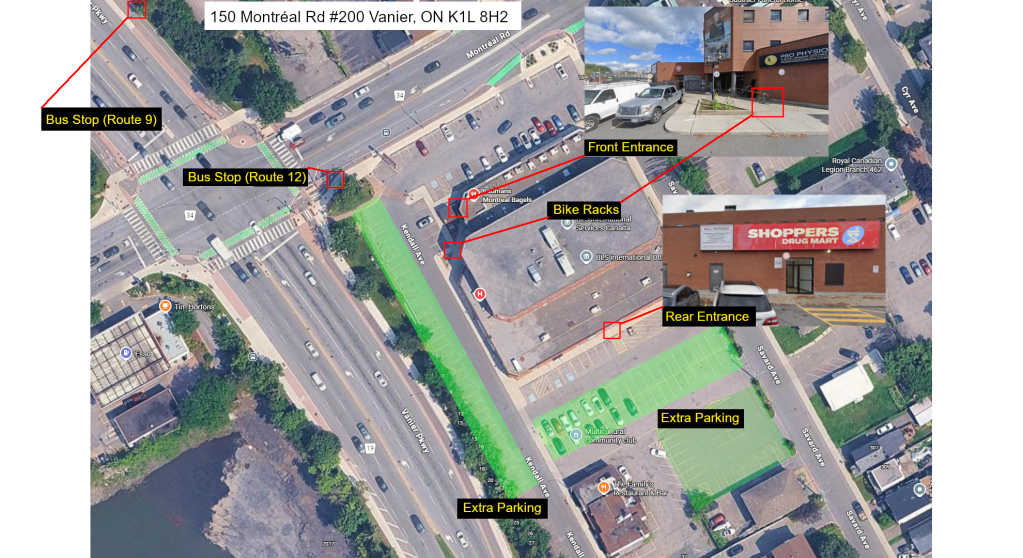 There is parking available at the front of the building off Montreal Road and additional parking and a second entrance at the back of the building (access from Savard Avenue). There is no charge for parking.